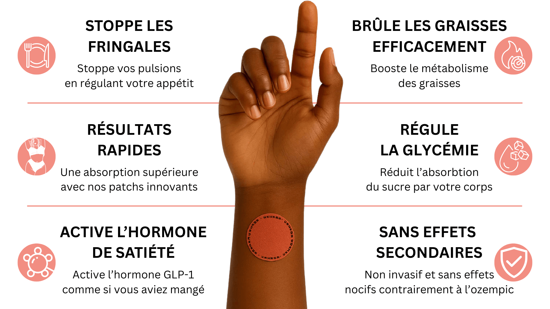 Contrairement aux injections, qui imitent le GLP-1 mais dont on ne connaît pas encore les effets sur le long terme, nos patchs sont une solution naturelle, douce et sans danger. Ils diffusent directement de manière continue les ingrédients actifs dans votre corps, sans aiguille, sans douleur et sans effort.